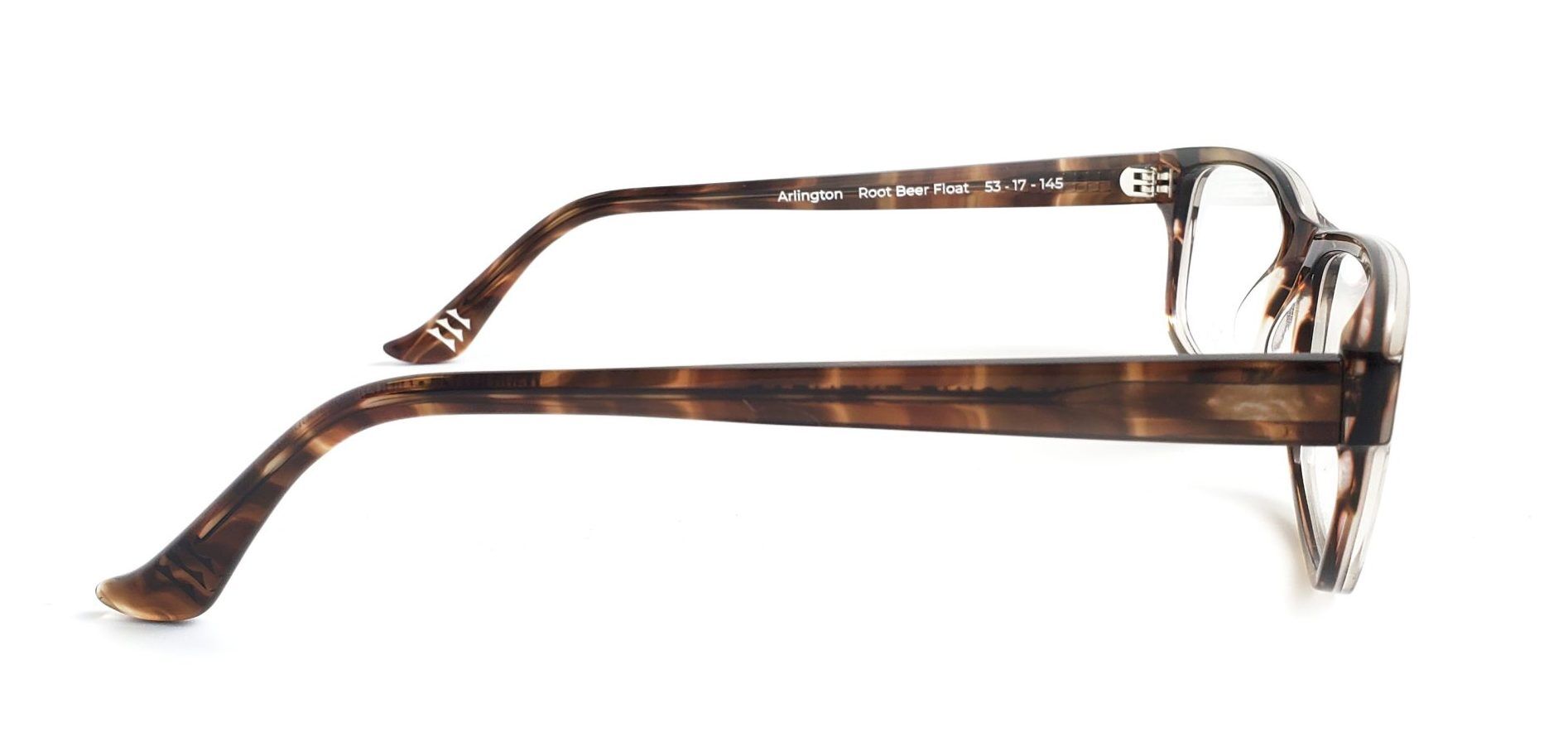 The Arlington features a rectangular lens shape with soft curves and an organic brow line. This frame draws inspiration from the hill it is nestled on and is available in Black and Root Beer Float.